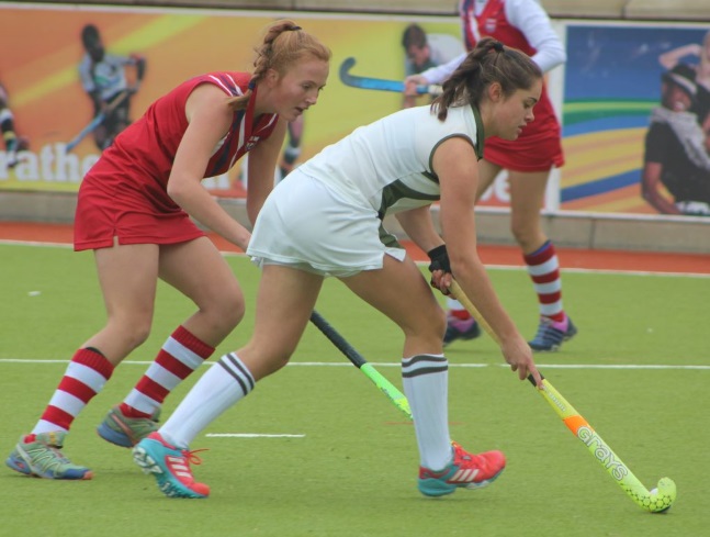 TEAGAN Roux of GHS (in red) in action against DSG during a hockey match in Komani. Find out the sports results of various schools in The Rep on Friday. Picture: SUPPLIED