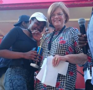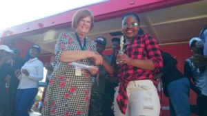 WELL DONE! Occupying first and third place at the Tamboekie Festival talent search competition were, from left, Zintle Yaka (first) with Border Agricultural Society chairwoman Jeanne Featherstone and third-placed Veniaque Zukhanye, who also received her prize from Featherstone. Find out more about the Tamboekie Festival in The Rep on Friday Pictures: SUPPLIED