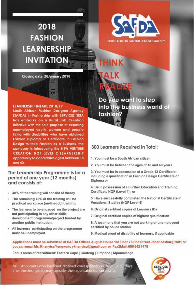 THE South African Fashion Designers Agency (SAFDA) in partnership with Services SETA, is searching for 150 fashion designers and craft producers that will take part in their 12 month learnership program.