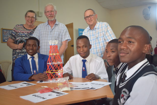 STEAM EDUCATION: Back from left, Get Ahead science teacher Esle Steyn, Nelson Mandela University (NMU) Goven Mbeki Mathematics Development Centre project manager, Professor Peter Weisswange and NMU Goven Mbeki Mathematics Development Centre director, Professor Werner Olivier, front from left, Bulela Mvimbi, Athi Makapela, Inganathi Tsotso and Colin Makhalibe at the STEAM summit education practical session in Get Ahead recently Picture: ABONGILE SOLUNDWANA