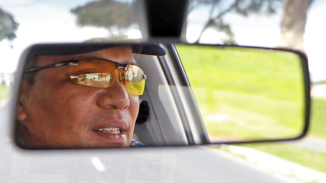 Metro police officer Sergeant Nikie Horn scopes a quiet street in Rondebosch East in Cape Town through his yellow tinted glasses as he drives up and down the neighbourhood.