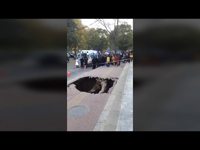 This is the terrifying moment a woman fell into a sinkhole that suddenly opened up beneath her feet in northwestern China in Lanzhou City in Gansu Province on November 11. A busy sidewalk suddenly collapses underneath a woman walking by, completely swallowing her up. According to reports, the woman was rescued and taken to hospital. Her ribs were broken but her life was in no danger.