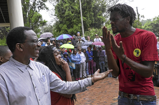 October 21, 2015. Dr Sizwe Mabizela, Vice Chancellor of Rhodes University tries to comfort 2016 incumbent SRC Vice-President Sizwe Dlomo after he is booed off the microphone for making unpopular statements during the “Fees must fall campaign” across the country. Johannesburg. Picture: Daylin Paul