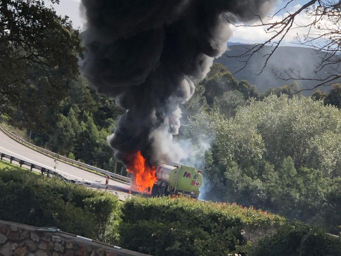 In a video of the accident shared on social media, a man can be seen getting out of a car which had run off the road and into bushes. He runs towards the flaming fuel tanker and lies down in the flames.