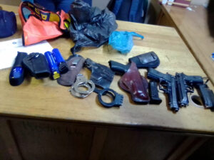 The health department said it consisted of 47 bullets, three 9mm hand guns, two pepper sprays, two handcuffs, one SAPS reflector vest and a police cap.