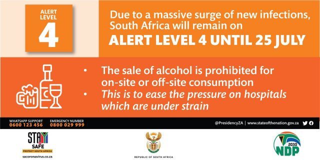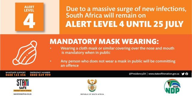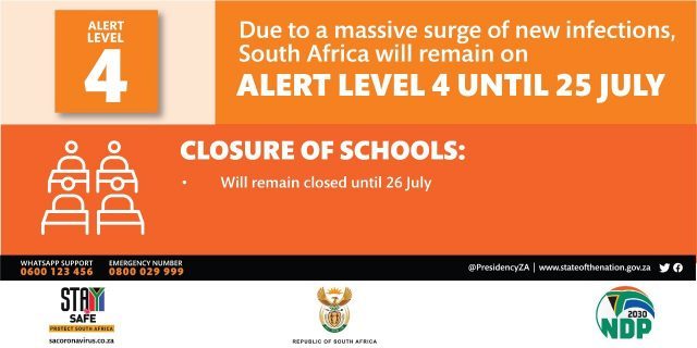 Cabinet after consultation with the provinces has decided to maintain the country at Adjusted Alert Level 4 for another 14 days. This means that from now until the 25th of July, the following measures will remain in place.
