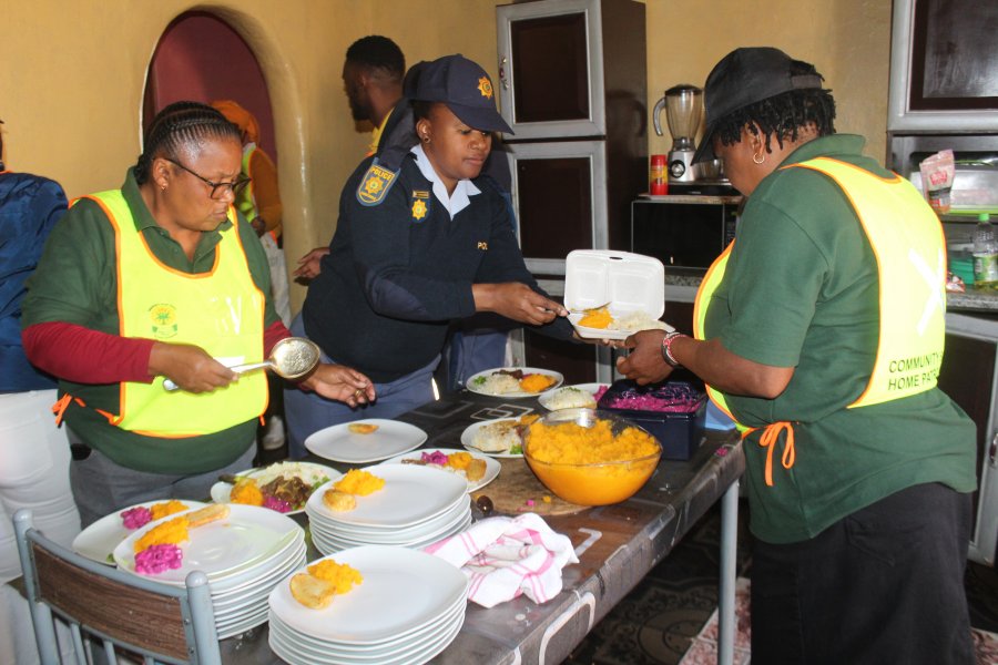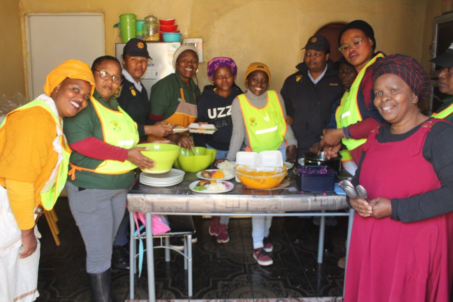 GIVING BACK: Members of the Mlungisi Saps’ social crime prevention unit together with the community policing forum (CPF) and its youth structure closed off Mandela Month by celebrating with 98-year-old Nomaneji Beauty Matitise from Nomzamo earlier today Pictures: ZINTLE BOBELO